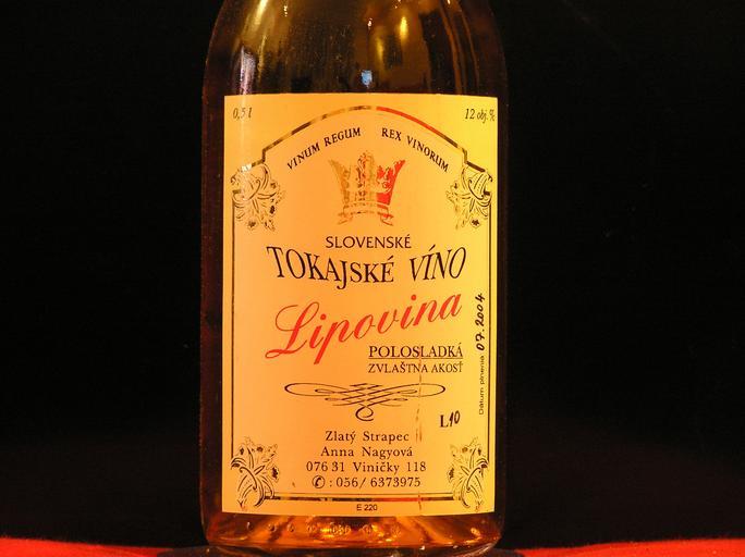 Keywords: Tokaj wine Lipovina.JPG Bottle of Tokaj wine Lipovina Semi sec author Legnaw 2004-11-01 own assumed Legnaw trademark Tokaj wines of Slovakia Wine labels