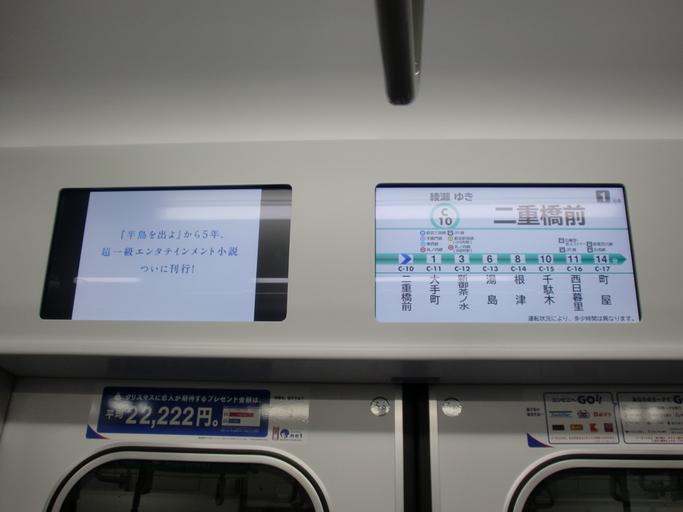 | Keywords: Tokyo Metro Chiyoda Line 16000 TVIS LCD display Ayase Depot 20101128.JPG TVIS LCD passenger information display inside Tokyo Metro Chiyoda Line 16000 series EMU car at Ayase Depot Open Day 京メトロ16000系のLCD式旅客案内表示器(TVIS) ja File TokyoMetro16000-tvis JPG 2010-11-28 ja user STTrain ja Japanese Wikipedia STTrain relicense Tokyo Metro 16000 series Train interiors of Tokyo Metro Liquid crystal displays in trains in Japan November 2010 in Japan 2010 in rail transport in Japan Photographs taken on 2010-11-28 Taken with Casio Exilim EX-Z270 |