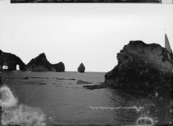 Keywords: blackandwhite monochrome outdoor black and white View of Tolaga Heads from Captain Cook's Cove, Gisborne. Shows rugged rock formations known as "The Haystacks" at the entrance to the harbour. Photograph taken between 1906 and 1912, by William Archer Price. Inscriptions: Inscribed - Photographer's title on negative -bottom right: Tolago Heads from Capt. Cooks Cove. 151C. Quantity: 1 b&w original negative(s). Physical Description: Dry plate glass negative Tolaga Heads from Captain Cook's Cove. Price, William Archer, 1866-1948 :Collection of post card negatives. Ref: 1/2-001230-G. Alexander Turnbull Library, Wellington, New Zealand. natlib.govt.nz/records/22778993 View of Tolaga Heads from Captain Cook's Cove, Gisborne. Shows rugged rock formations known as "The Haystacks" at the entrance to the harbour. Photograph taken between 1906 and 1912, by William Archer Price. Inscriptions: Inscribed - Photographer's title on negative -bottom right: Tolago Heads from Capt. Cooks Cove. 151C. Quantity: 1 b&w original negative(s). Physical Description: Dry plate glass negative Tolaga Heads from Captain Cook's Cove. Price, William Archer, 1866-1948 :Collection of post card negatives. Ref: 1/2-001230-G. Alexander Turnbull Library, Wellington, New Zealand. natlib.govt.nz/records/22778993