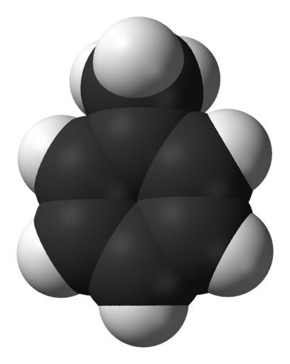 | Keywords: Toluene-from-xtal-3D-vdW.png Space-filling model of the toluene molecule C<sub>7</sub>H<sub>8</sub> as found in the crystal structure X-ray crystallographic data from <small>J Chim Phys Phys -Chim Biol 1977 74 68-73</small> Model constructed in http //www crystalmaker com/ CrystalMaker 8 1 Image generated in http //accelrys com/products/discovery-studio/visualization/discovery-studio-visualizer html Accelrys DS Visualizer Own 2009-03-15 Ben Mills Benjah-bmm27 Images by Ben Mills Toluene |