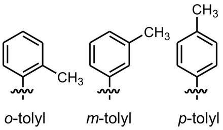 Keywords: Tolyl group structure.svg C - en Structure of tolyl group / methylphenyl group ja トリル基の構 Own work made with ChemDraw Su-no-G 2008-09-06 Functional groups