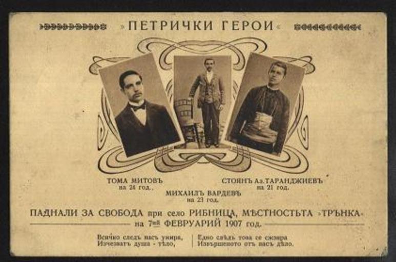 Keywords: Toma Mitov Mihail Vardev Stoyan Tarandzhiev.JPG Тома итов ихаил Ва дев Стоян Та анджиев scanned < 1913 Author Anonymous-EU People of Petrich IMARO Revolutionaries from Bulgaria