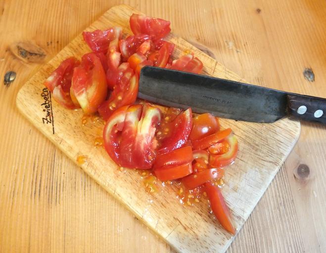 Keywords: tomato tomato pieces cores knife cut board kitchen cook frisch juicy red kitchen table vegetables food blade sharp