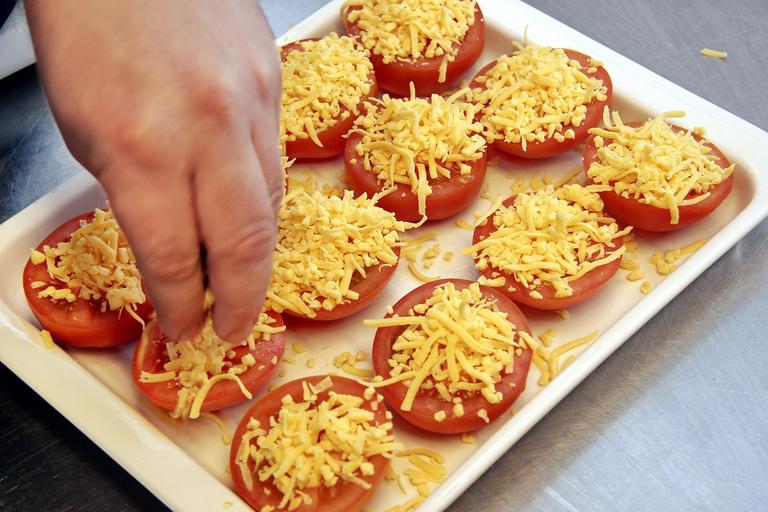 Keywords: tomatoes gratin cheese mozzarella oven garnish baked dining food taste sprinkle cooking provisioning