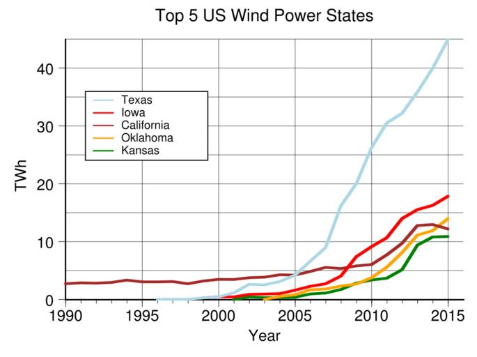 | Keywords: Top Five US Wind States.svg en Trends of wind electrical generation in the top five states 1990-2015 http //www eia gov/electricity/data/state/ US EIA data 2014-11-17 own Delphi234 other versions Generated with Wikimedia SVG Chart SVG Chart/box cc-zero Wind energy statistics of the United States Files that need updating annually |