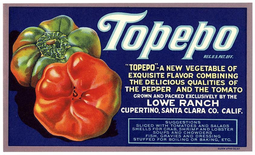 Keywords: topepo lowe ranch loweranch photo border indoor food Repository: California Historical Society Collection: Crate, can, and bottle label collection Date: Undated Call Number: Kemble Spec Col 08 Digital object ID: Kemble Spec Col 08_032.jpg General note: “A new vegetable of exquisite flavor combining the delicious qualities of the pepper and the tomato. Grown and packed exclusively by the Lowe Ranch, Cupertino, Santa Clara Co., Calif.” Preferred citation: Topepo label, Olsen Litho. Co., Crate, can, and bottle label collection, Kemble Spec Col 08, courtesy, California Historical Society, Kemble Spec Col 08_032.jpg. Online finding aid: www.oac.cdlib.org/findaid/ark:/13030/c8s75jq0/ Repository: California Historical Society Collection: Crate, can, and bottle label collection Date: Undated Call Number: Kemble Spec Col 08 Digital object ID: Kemble Spec Col 08_032.jpg General note: “A new vegetable of exquisite flavor combining the delicious qualities of the pepper and the tomato. Grown and packed exclusively by the Lowe Ranch, Cupertino, Santa Clara Co., Calif.” Preferred citation: Topepo label, Olsen Litho. Co., Crate, can, and bottle label collection, Kemble Spec Col 08, courtesy, California Historical Society, Kemble Spec Col 08_032.jpg. Online finding aid: www.oac.cdlib.org/findaid/ark:/13030/c8s75jq0/