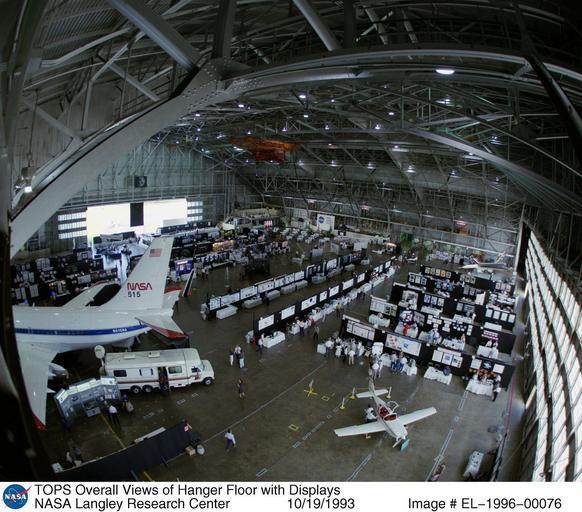 Keywords: TOPS Overall Views of Hangar Floor with Displays DVIDS711796.jpg en The Technology Opportunities Showcase TOPS featured NASA Langley technology innovations available to industry for licensing and commercialization The three-day event held at NASA's Langley Research Center October 19-21 1993 highlighted NASA's multiple use technology as a cornerstone in strengthening U S competitiveness in the world marketplace Under the Clinton administration's new direction to place government in a pivotal role to help industry non-aerospace companies small and minority businesses as well as universities are encouraged to market products derived from Federal lab innovations More than 160 exhibits featured advanced research and technology in high-speed aeronautics subsonics and hypersonics high-performance aircraft large-scale computing atmospherics space transport and spacecraft NASA Identifier L93-11792 2009-09-24 Glenn Research Center https //www dvidshub net/image/711796 711796 2012-10-10 17 06 WASHINGTON DC US PD-USGov Langley Research Center Images from DoD uploaded by Fæ