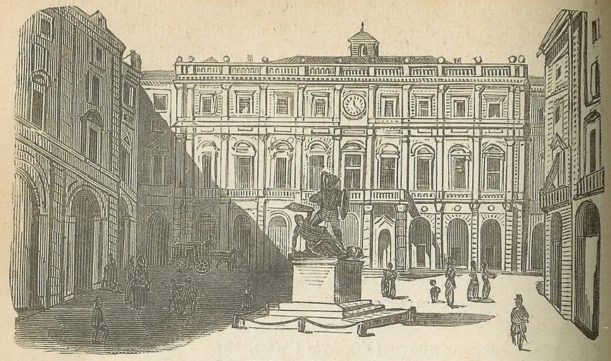 Keywords: Torino e suoi dintorni 028.jpg en Engraving showing Piazza palazzo di Città in Turin Italy In the middle of the square is shown the Monument to Conte Verde and in the background the town hall it Incisione raffigurante Piazza Palazzo di Città a Torino Al centro della piazza è collocato il Monumento al Conte Verde mentre sullo sfondo si nota il municipio Palazzo di Città Guglielmo Stefani Domenico Mondo Torino e suoi dintorni - guida storico-artistica amministrativa e commerciale Torino Carlo Schiepatti 1852 Pagina 140 photography by Anassagora unknown Domenico Mondo Turin 1852 45 4 22 9 N 7 40 53 E PD-old Torino e suoi dintorni Engravings of Turin Municipio Turin Monument to Conte Verde Turin