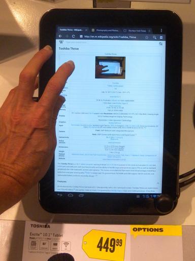 Keywords: Toshiba Excite 10.1 tablet B&H jeh.jpg en Tablet computer at B H Photo 2012-06-14 own Jim henderson cc-zero Uploaded with UploadWizard Toshiba computers Android tablets Images of devices displaying Wikipedia
