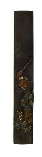Keywords: Toshiyuki - Kozuka with a Chinese Man - Walters 51722.jpg A man in Chinese dress is shown with his arm raised over his head He holds a stick in his right hand and is gesturing to the ground with his left This may be a reference to a specific person On the ground are some grasses and stones The artist signed the kozuka on the reverse century 19 Edo shibuichi copper gold cm 9 6 l accession number 51 722 19411 Henry Walters Baltimore date and mode of acquisition unknown Walters Art Museum Henry Walters Acquired by Henry Walters Signature Ryƻresshi Toshiyuki place of origin Mito Japan Walters Art Museum license Kozuka in the Walters Art Museum Toshiyuki Media contributed by the Walters Art Museum needs category review