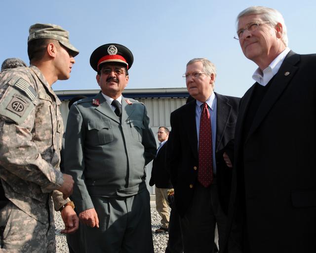| Keywords: Tour of Central Training Facility DVIDS240702.jpg en U S Army Spc Mohamad Azimi left translates for Afghan Brig Gen Khudadad Agah second from left commander Training Centers and U S Senators Roger F Wicker right and Mitch McConnell at the Central Training Facility Kabul Jan 9 2010 Sens Wicker and McConnell were joined by Sens Lisa Murkowski and Mike Crapo and Rep Michael Castle for a visit to CTC and other facilities in the area The Congressional delegation received briefings from CTC NATO Training Mission-Afghanistan and International Security Assistance Force senior leadership and met with Afghan national police officers while in the Kabul area The mission of NTM-A is to train the Afghan national security forces and enhance the government of the Islamic Republic of Afghanistan's ability to achieve a stable and secure country 2010-01-09 Chief Petty Officer Julian Carroll https //www dvidshub net/image/240702 100109-N-+++++-015 2010-01-17 14 08 KABUL AF PD-USGov-Military-Navy NATO Training Mission - Afghanistan Images from DoD uploaded by Fæ |