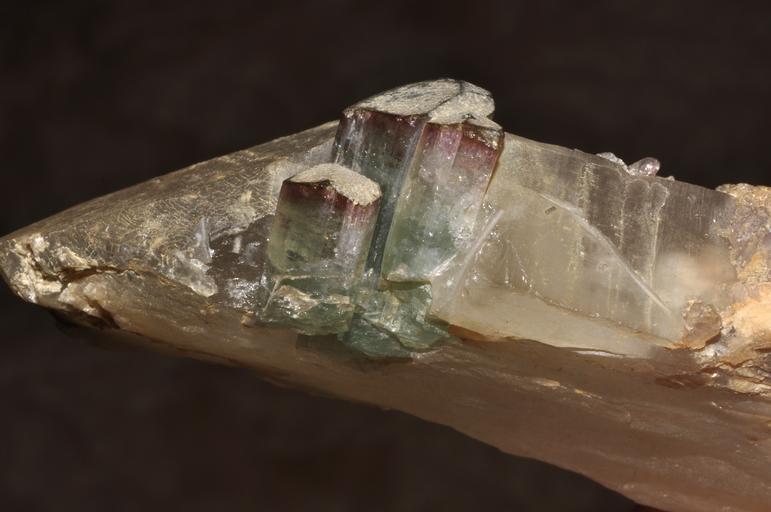 Keywords: Tourmalines polychromes sur quartz (Brésil).jpg fr cristaux de tourmalines var elbaite sur cristal de quartz biterminé own Parent Géry 28/01/10 Elbaite Tourmaline Quartz Taken with Nikon D90