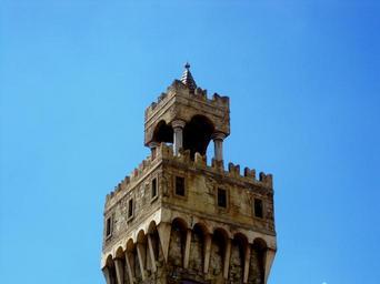Keywords: tower parapet serated edge pillars stone color tall windows blue sky