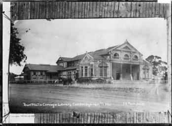 | Keywords: cambridge architecture building library frederick george radcliffe frederickgeorgeradcliffe arquitectura new zealand newzealand blackandwhite monochrome outdoor photo border black and white The Town Hall and Carnegie Library at Cambridge, circa 1910s. Photograph taken by Frederick George Radcliffe, with in a different script, a photographer's number added by William Archer Price, which follows the Price sequence of numbers. Inscriptions: Inscribed - Photographer's title on negative -bottom left: Town Hall & Carnegie Library. Cambridge. F.G.R. No. 3241bottom right: J.R. Philp Series. Quantity: 1 b&w original negative(s). Physical Description: Dry plate glass negative 4.5 x 6.5 inches Radcliffe, Frederick George, 1863-1923. Town Hall & Carnegie Library, Cambridge, ca 1910s - Photograph taken by Frederick George Radcliffe. Price, William Archer, 1866-1948 :Collection of post card negatives. Ref: 1/2-001388-G. Alexander Turnbull Library, Wellington, New Zealand. natlib.govt.nz/records/23023419 The Town Hall and Carnegie Library at Cambridge, circa 1910s. Photograph taken by Frederick George Radcliffe, with in a different script, a photographer's number added by William Archer Price, which follows the Price sequence of numbers. Inscriptions: Inscribed - Photographer's title on negative -bottom left: Town Hall & Carnegie Library. Cambridge. F.G.R. No. 3241bottom right: J.R. Philp Series. Quantity: 1 b&w original negative(s). Physical Description: Dry plate glass negative 4.5 x 6.5 inches Radcliffe, Frederick George, 1863-1923. Town Hall & Carnegie Library, Cambridge, ca 1910s - Photograph taken by Frederick George Radcliffe. Price, William Archer, 1866-1948 :Collection of post card negatives. Ref: 1/2-001388-G. Alexander Turnbull Library, Wellington, New Zealand. natlib.govt.nz/records/23023419 |