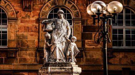 Keywords: town hall stature window lamp woman child son daughter orange yellow kassel old architecture building germany nostalgia antique street lighting