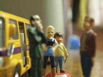 Keywords: toy miniature waiting bus stop public transport bus teen girl impatience standing