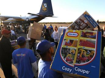 | Keywords: Toys for Tots donation DVIDS346786.jpg en Volunteers from local organizations work with military personnel to offload toys delivered by Fat Albert a C-130 Hercules assigned to the U S Navy flight demonstration squadron the Blue Angels at Naval Air Station Joint Reserve Base New Orleans The Blue Angels delivered thousands of toys donated by Lockheed Martin employees to the Marine Corps Reserve Forces Command Toys for Tots program Toys R Us also donated 1 million in toys to the program Marines will distribute the toys to families in the Greater New Orleans Area during the holiday season <br>Unit Navy Media Content Services 2010-12-02 John Paul Curtis https //www dvidshub net/image/346786/toys-tots-donation 101202-N-+++++-004 2010-12-06 20 06 NEW ORLEANS LA US PD-USGov-Military-Navy Lockheed C-130 Hercules Blue Angels Images from DoD uploaded by Fæ |