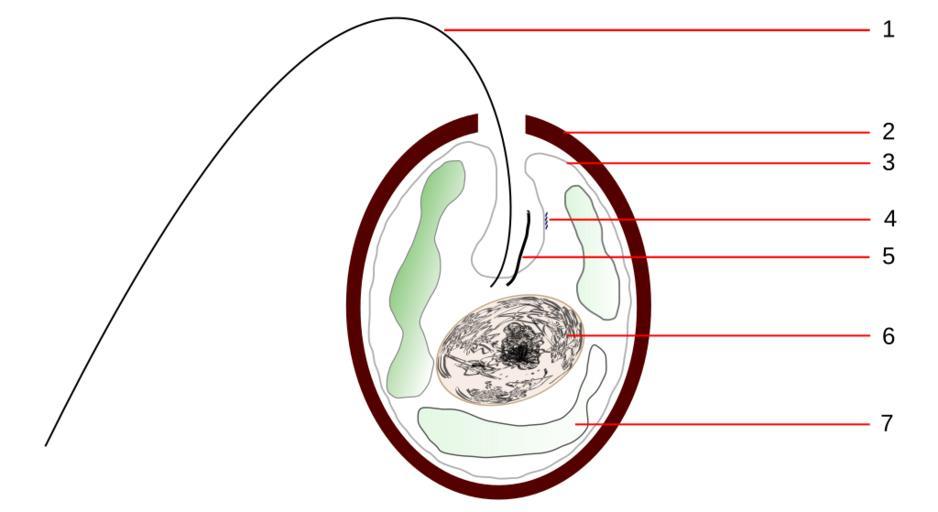 | Keywords: Trachelomonas lorica.svg Trachelomonas euglenoid with a lorica 1 /5 flagella; 2 lorica; 3 cell membrane; 4 eyespot; 6 nucleus; 7 chloroplasts Trachelomonas еугленоидна алга са ло иком 1 дужи бич; 2 ло ика; 3 ћелијска мемб ана; 4 очна м ља; 5 к аћи бич; 6 јед о; 7 хло опласт Own 2008-02-09 Wlodzimierz Trachelomonas Algal diagrams |