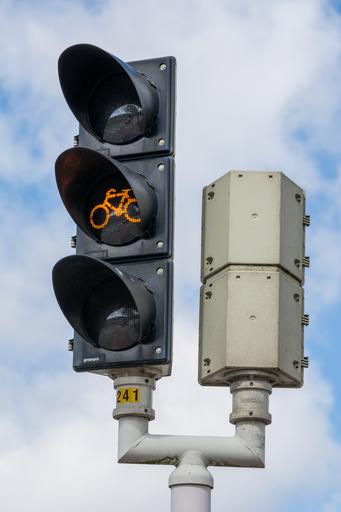 Keywords: traffic light traffic lights crossing danger sign crossroads light orange orange light bicycle cyclist cycling doubt positivity hesitation agreement appointment consent traffic rules appointments