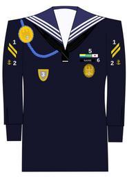 Keywords: Trageweise (Marine) 2.svg en Permissible Wearing of Orders decorations badges and markings on the uniform of the Navy for enlisted Sailors under 30 years<br /> 1 Rank insignia<br /> 2 Career Badge<br /> 3 internal Badge<br /> 4 German Armed Forces Badge of Marksmanship NCO only <br /> 5 ribbon bar<br /> 6 nameplate<br /> 7 Badge for Military Proficiency<br /> de Zulässige Trageweise von Orden Ehrenzeichen Abzeichen und Kennzeichnungen an der Uniform der Marine für Mannschaftsdienstgrade bis zum 30 Lebensjahr<br /> 1 Dienstgradabzeichen<br /> 2 Verwendungsabzeichen<br /> 3 internes Verbandsabzeichen nur im Bereich ZMIlDBw/integrierte Verwendung <br /> 4 Schützenschnur<br /> 5 Bandschnalle<br /> 6 Namensschild<br /> 7 Leistungsabzeichen<br /> own Flor an File Trageweise Marine 2 jpg Redraw of <gallery>File Trageweise Marine 2 jpg</gallery> Navy dress uniforms of Bundeswehr Military decorations of Germany Bundeswehr Illustrations of methods of wearing orders decorations and medals Cc-zero
