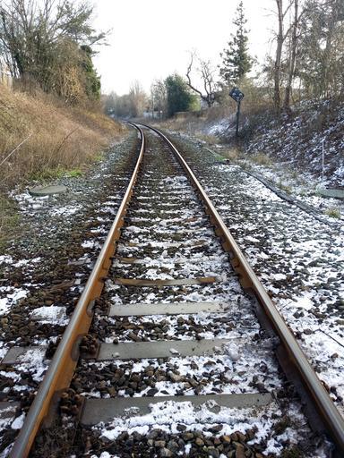 Keywords: train rails transport railway travel station journey perspective winter snow