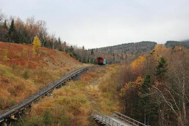 Keywords: train tracks caboose grass trees horizon transport railroad car travel railway outdoor landscape metal tracks country countryside landmark mt washington cog railway