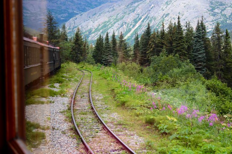 Keywords: train transport railroad scene passenger tracks mountains forest woods trail path cargo