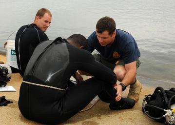 Keywords: Training exercise 120919-N-ZQ794-035.jpg en Chief Navy Diver Jamie Harris assigned to Mobile Diving and Salvage Unit 2 assesses the medical status of a Navy diver during a training exercise at Joint Expeditionary Base Little Creek - Fort Story Sept 19 MDSU is capable of planning coordinating directing and conducting anti-terrorism force protection missions disaster relief efforts battle damage repair underwater search operations harbor and waterway clearance emergent underwater repairs and salvage operations 2012-09-19 Petty Officer 3rd Class Kay Savarese https //www dvidshub net/image/669356 120919-N-ZQ794-035 2012-09-21 10 24 VIRGINIA BEACH VA US PD-USGov-Military-Navy United States Navy Mobile Diving and Salvage Unit Two Images from DoD uploaded by Fæ