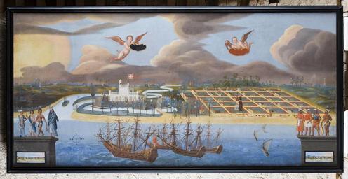 Keywords: Tranquebar - Skoklosters slott - 86273.tif Tavlan tillkommen efter att fortet rustats upp av kvartermästaren Andersen Kongsbat En gren av Caleroon-floden omger det vita Dansborg-fortet på vars vänstra torn man kan se en stor palm I floden ligger Gallow-Tarna Bokstäverna i stadskvarten markerar a tullhuset c den södra husraden med Kongsbaks hus e den portugisiska kyrkan h pagoder i moskeer h hyddor I förgrunden fem fregatter <br/>Till vänster och till höger postament med vardera fyra figurer i olika klädnader Två svävande änglar hållande tomma kartuscher <br/><br/>Bakvänt E med röd färg till vänster på duken 9 med blyerts på nedre spännramen <br/>Ny kilad spännram Svart profilerad spikhål längs innerkanten tvärslå på höjden <br/><br/>A view of Tranquebar <br/>A view of the Danish colony of Tranquebar with the Dansborg fortress in south east India The painting is executed after the restauration of the fortress by Eskil Andersen Kongsbakke in 1657-58 Kongsbakke later built a wall around the town in 1660 which is not visible in the painting The letters in the town quarters represent a custom warehouse c the southern part with the house of Kongsbakke e the Portuguese church h the pagoda i mosques In the left and right corner of the canvas are figures dressed in various costumes <br/>The painting was taken as war booty by Carl Gustaf Wrangel during the war between Sweden and Denmark maybe from Frederiksborg Castle in 1660 original caption Tranquebar <br/> Nyckelord Målning Landskap Moln Puttisar Skepp Tranquebar Föremålsbild ca 1658 oil on canvas size mm 1325 2735 SKO Carl Gustaf Wrangel place of origin original filename sm_dig4170_9626 30728 inventory number SKO 9626 86273 PD Jens Mohr Jens Mohr Clouds in art Media contributed by LSH unmatched objKeyword Media contributed by LSH unmatched keyword Media contributed by LSH 2013-10