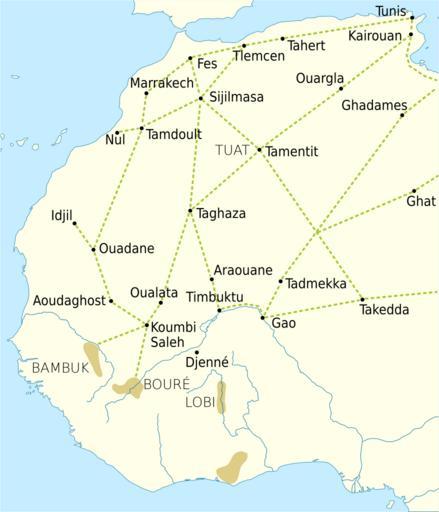 | Keywords: Trans-Saharan routes early.svg en Trade routes of the Western Sahara c 1000-1500 Goldfields are indicated by light brown shading Map Map data from http //www naturalearthdata com/ 1 50m data Projection Equirectangular - Lat/Long - plate carrée Map limits N 38N S 3N E 12E W 18W Software Grass GIS 6 4 1 Inkscape 0 48 1 Scaled x30 in Inkscape to give 30 pixels per degree Routes The routes shown are based those given by Mauny 1961 Mauny gives maps for three periods 8th-10th centuries on page 429 11th-13th on page 430 and after the 14th century on page 434 The position of the goldfields is based on Mauny 1961 page 295 Levtzion has published a map of the trade routes both in Levtzion 1973 and in Levtzion Hopkins 1981 The map shows Tahert modern Tiaret in Algeria to the south of Tlemcen In fact Tahert should be to the East and slightly to the North of Tlemcen The map also shows Tamentit on the Draa River In fact Tamentit is one of the oases of Tuat “ and instead the town of Tamdoult Tamdult lay near Akka to the north of the Draa A map showing trade routes 10th to 16th centuries is given in Cuoq 1975 on page 11 This map repeats the error made by Levtzion 1973 in placing Tahert to the south of Tlemcen Toponyms Assumptions the capital of Ghana was at Koumbi Saleh Takedda was at Azelik Aoudaghost was at Tegdaoust The Malian capital has not been included - there is no consensus on the location Orthography Aoudaghost - Awdaghost - Awdaghust Araouane - Araouane - Arawan Ouadane - Ouadane - Wadan Oualata - Oualata - Walata Ouargla - Wargla - Wargala Sijilmasa - Sidjilmassa - Sijilmasa References citation Cuoq Joseph M translator and editor 1975 Recueil des sources arabes concernant l'Afrique occidentale du VIIIe au XVIe siècle BilÄd al-SÅ«dÄn Éditions du Centre National de la Recherche Scientifique Paris French 11 Reprinted in 1985 with corrections and additional texts ISBN 2222017181 citation Levtzion Nehemia Ancient Ghana and Mali Methuen London 1973 0841904316 138-139 Reprinted 1980 citation Levtzion Nehemia Hopkins John F P eds and trans Corpus of Early Arabic Sources for West Africa Marcus Weiner New York NY 2000 1-55876-241-8 xxii First published in 1981 by Cambridge University Press ISBN 0521224225 citation Mauny Raymond 1961 Tableau géographique de l'ouest africain au moyen age d ™après les sources écrites la tradition et l'archéologie Institut français d'Afrique Noire Dakar French 426-432 Further reading citation Devisse J 1988 Trade and trade routes in West Africa el Fasi M General History of Africa Volume 3 Africa from the Seventh to the Eleventh Century Berkeley University of California Press 367-435 0520039149 Includes a map of the Sahara showing isohytes and schematic diagrams of the trade routes with the number of stages specified by Ibn Hawkal al-Bakri and al-Idrisi 2011-08-05 own Aa77zz cc-zero Uploaded with UploadWizard Sahara Trade routes Maps showing history of Africa |