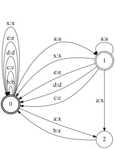 | Keywords: Transduktor Informatik1.png 2006-03-30 own assumed Tombox2005~commonswiki Finite state machine https //commons wikimedia org/w/index php title File Transduktor_Informatik1 png oldid 164505072 This version created with graphviz from following source <pre> digraph G graph layout dot ranksep 3 nodesep 0 4 rankdir LR center 1 margin 0 comment author Wikipedia Jaleks node shape circle fixedsize true width 75 fontsize 20 edge label 1 fontsize 21 // nodes with labels q0 label 0 shape doublecircle style bold q1 label 1 shape doublecircle q2 label 2 // edges q0->q0 label \nb b dir back q0->q0 label \nc c dir back q0->q0 label \nd d dir back q0->q0 label \ne e dir back q0->q0 label x x dir back q0->q1 label a a weight 0 // weight adjusting to show most arrow heads q1->q2 label a x q0->q2 label a x q1->q1 label a a dir back q1->q0 label x x weight 2 // weight adjusting to show most arrow heads q1->q0 label e e q1->q0 label d d q1->q0 label c c q2->q0 label b ε weight 5 // weight adjusting to show most arrow heads // adjust positioning a bit rank same; q1 q2 / author Wikipedia Jaleks / </pre> |