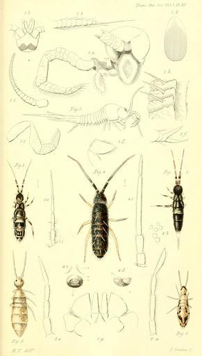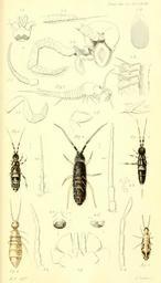 Keywords: TransEntSocLond1plate11.jpg s of the Irish Species of Thysanura PLATE XI FORBICINA Geoff Sp 1 Polypoda Linn Plate XI Fig 1 Very common in dry stone ditches and mossy places Fig 1 Outline of the animal magnified la Head seen in front 1b Superiorly 1 c Antenna 1d Last joint of the palpus 1 e The foreleg 1f The hind foot 1g Jaws which are very thin and membranous 1 h Inside showing the auxiliary legs; the back is placed to the right 1 l The auxiliary foot with which it ascertains the presence of the object against which the tail is adpressed 1k A scale much magnified to show the lines producing the iridescence from 9 000 to 11 000 in an inch ORCHESELLA Sp 1 Orchesella filicornis Plate XI Fig 2 Fig 2 Insect magnified 2 a Left antenna Sp 2 Orchesella cincta vaga Fab Plate XI Fig 3 Fig 3 Insect magnified PODURA Linn Sp 1 Podura plumbea Linn Plate XL Fig 4 Fig 4 The insect magnified 4 a Left antenna 4 b Configuration of the left eyes 4c Represents the mouth; x the positions of the antennae; + a cylindric ring moveable and inclosing the manducatory organs ; ° the labium transverse striated longitudinally in the middle and with a minute hemispheric tubercle laterally closely adpressed against ° in the state of rest 4° The labrum fimbriated at its apex along the diameters of two convex semicircles placed on the basal part of the lip There is no appearance of lateral pieces internally or anything resembling maxillae These lips are moved to and fro with considerable rapidity but seem to have little prehensile power as they were unable to seize upon the minute hairs of the sable pencil which I passed into the mouth A singular apparatus is protruded from the 1st abdominal ring beneath which will be noticed under Podura stagnorum it is common to all the Podurae Sp 2 Podura nitida Plate XI Fig 5 Fig 5 Insect magnified 5 a Antenna of left side Sp 3 Podura nigro-maculata minuta Fab Plate XI Fig 6 Fig 6 Insect magnified 6a Antenna of left side seen in profile 2011-06-24 http //www biodiversitylibrary org Robert Templeton PD-old-100 Uploaded with UploadWizard Robert Templeton Plates Transactions of the Entomological Society of London |