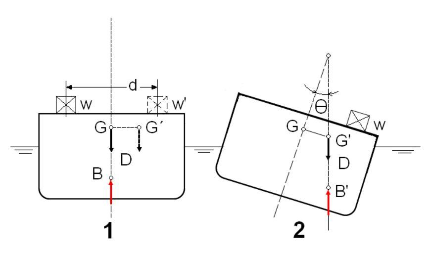 Keywords: TranslacionTP.PNG es Esquema de translación trasversal de peso en un buque en Ship trasversal movements of weights Own 2007-03 Claudio Elias Naval architecture