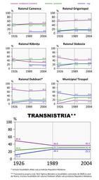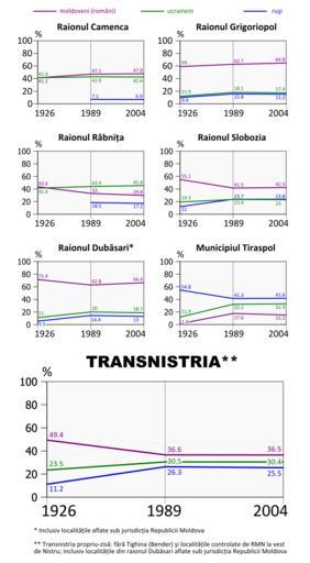 Keywords: Transnistria evolutie etnica.png ro Grafic reprezentand evolutia principalelor 3 etnii din Transnistria la nivelul raioanelor si a mun Tiraspol dupa datele recensamintelor sovietice din 1926 si 1989 si a recensamantului organizat de autoritatile separatiste de la Tiraspol în anul 2004 en Graph representing the evolution of the 3 main ethnic groups in Transnistria at raion and municipality level according to the Soviet censuses of 1926 and 1989 and the census organized by the Transnistrian sepparatist authorities in 2004 own Andrein 2010-05 Ethnic groups in Transnistria |