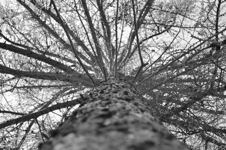 Keywords: tree grey looking up high tall black and white branches woods woody wooden trunk bark leaves gray upwards view sky background plants flora graphics effects visual