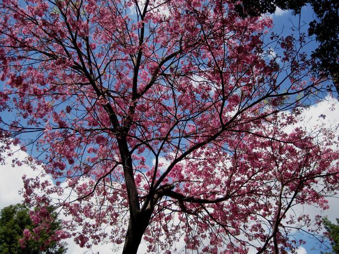 Keywords: tree pink flowers covered spring fresh pretty blue sky clouds