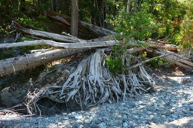 Keywords: trees fallen dead roots exposed decay forest pebbles rocks brook spring dried up nature