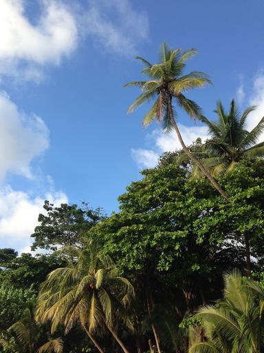 Keywords: trees greenery plants nature palms coconut trees wooden woody trunks blue sky white fluffy clouds scenic scenery forests gardens parks thick dense flora vegetation foliage branches green leaves leafy lush