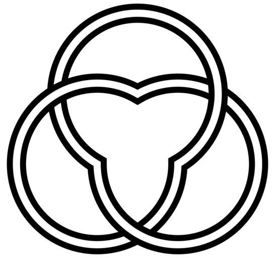 | Keywords: Trefoil-Triquetra.svg An architectural trefoil i e symmetrical pattern of three partially-overlapping circles which is also a triquetra i e simple threefold closed knot Consists of three 300° circular arcs For non-interlaced architectural trefoil see File Trefoil-Architectural png etc Self-made graphic converted from the following PostScript source code <pre> 306 396 translate 4 dup scale/x 201 9613115 -116 6025 403 9226231 def/B 1 setgray 36 setlinewidth x 180 120 arc gsave 0 setgray 96 setlinewidth stroke grestore stroke def gsave B 2 -120 rotate B repeat grestore/A 96 setlinewidth 0 setgray x 230 251 arc stroke 1 setgray 36 setlinewidth x 229 252 arc stroke def A 2 120 rotate A repeat showpage EOF </pre> 2010 AnonMoos thumb center Artistic example Trefoils in architecture Interlaced triquetra Trefoil knot diagrams with 3-fold rotational symmetry Decorative knots Images with PostScript source code Knots and links on transparent background Outline knots and links |