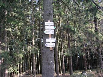 Keywords: Třemošná.JPG Rozcestník na vrcholu Třemošné Olympus C5050 2007 Petr Dudík Třemošná Brdy Hiking and footpath fingerposts in Příbram District