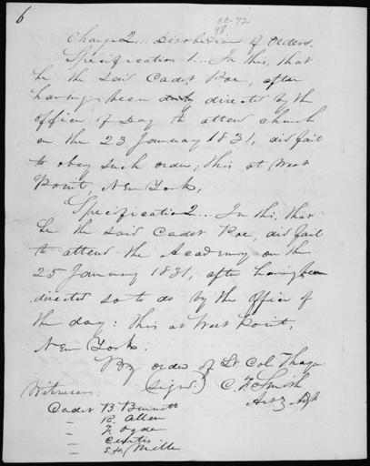 | Keywords: Trial of Cadet E. A. Poe - NARA - 301660.jpg Scope and content Poe arrived at West Point in June 1830 and submitted himself to the rigors and regimens of the Academy There were long days filled with study and military drills The food was poor the quarters crowded and spartan and discipline rigid Poe did well academically but was soon undone by continuing quarrels with his foster father and money problems During his first term he decided to leave West Point but could not resign without the consent of his foster father When Allen did not consent Poe set out to get himself court-martialed and dismissed He neglected his studies and failed to report for parades roll-calls and guard duty On January 28 1831 he was court-martialed These papers from the trial list charges against Cadet Poe gross neglect of duty and absence from his academical duties; on March 6 1831 he was dismissed from West Point by sentence of court-martial General notes Exhibit History American Originals December 1997 - December 1998 National Archives Washington DC Exhibit No 624 0196 301660 Local identifier War Department Office of the Judge Advocate General 1884 - 09/18/1947 Most Recent <br /> War Department The Adjutant General's Office 1821 - 04/28/1904 Predecessor <br /> War Department Bureau of Military Justice 1864 - 1884 Predecessor NARA-Author Poe Edgar Allan 1809-1849 Defendant 1307948 <br /> Archives I Reference Section Textual Archives Services Division NWCT1R National Archives Building 7th and Pennsylvania Avenue NW Washington DC 20408 1831-01-28 Record group Record Group 153 Records of the Office of the Judge Advocate General Army 1792 - 2010 Record group ARC 482 Court Martial Case Files compiled 12/1800 - 10/1894 Series ARC 301659 File unit File unit ARC Variant control numbers NAIL Control Number NWCTB-153-PC29E15-CC72 2 <br /> NAIL Control Number NWDT1-153-PC29E15-CC72 2 Other versions <gallery> File Trial_of_Cadet_E _A _Poe_-_NARA_-_301660 tif tif </gallery> NARA-cooperation PD-USGov United States Military Academy Edgar Allan Poe Courts martial 1831 documents United States military law |