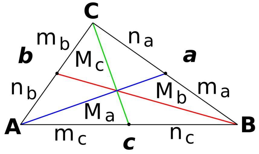 | Keywords: Triangle3Medians3ColRGB-01.svg en Triangle with conventional designation and 3 median in color red green blue es Triángulo con designación convencional y las 3 medianas en colores rojo verde azul own Gusbelluwiki 2011-03-23 Cc-zero Euclidean geometry Mathematical theorems |