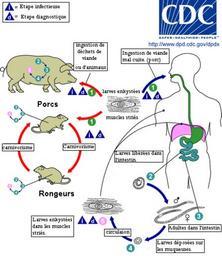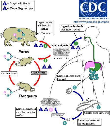 Keywords: Trichinella LifeCycle(French version).GIF Trichinellosis Trichinella spiralis T pseudospiralis T nativa T nelsoni T britovi Traduction en français de l ™image suivante Trichinella_LifeCycle GIF Life cycle of Trichinella spp Trichinellosis is acquired by ingesting meat containing cysts encysted larvae of Trichinella After exposure to gastric acid and pepsin the larvae are released from the cysts and invade the small bowel mucosa where they develop into adult worms female 2 2 mm in length males 1 2 mm; life span in the small bowel 4 weeks After 1 week the females release larvae that migrate to the striated muscles where they encyst Trichinella pseudospiralis however does not encyst Encystment is completed in 4 to 5 weeks and the encysted larvae may remain viable for several years Ingestion of the encysted larvae perpetuates the cycle Rats and rodents are primarily responsible for maintaining the endemicity of this infection Carnivorous/omnivorous animals such as pigs or bears feed on infected rodents or meat from other animals Different animal hosts are implicated in the life cycle of the different species of Trichinella Humans are accidentally infected when eating improperly processed meat of these carnivorous animals or eating food contaminated with such meat http //www dpd cdc gov/dpdx/images/ParasiteImages/S-Z/Trichinellosis/Trichinella_LifeCycle gif PD-USGov Trichinella life cycle biology PD-USGov CDC lifecycles Trichinella life cycle |