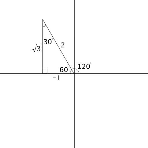 Keywords: TrigTriangleAt120Degrees.svg en A 30-60-90 degree triangle inscribed on a Cartesian plane at a 120 degree angle Created in Inkscape 2015-05-15 own Jbeyerl other versions Trigonometric triangles Uploaded with UploadWizard