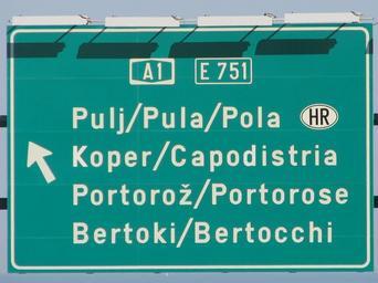 Keywords: Trilingual traffic sign on A1 near Koper.jpg Trilingual traffic sign on A1 motorway near Koper Slovenia Traffic sign displays names of the cities in Slovene official language in Slovenia; Pulj Portorož Koper Bertoki and Italian language of national minority in Koper; Pola Portorose Capodistria Bertocchi The title for Pula Croatia also displays the name of the city in Croatian since this is the official language of Croatia own own photo 2007-06-24 romanm talk public domain <gallery>Image Slovenija avtocesta A1 razcep Srmin jpg</gallery> Bilingual road signs in Slovenia Directional road signs in Slovenia Trilingual signs in Slovenia A1 motorway Slovenia Road signs in Italian language Croatian inscriptions in Slovenia Italian inscriptions in Slovenia |