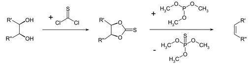 | Keywords: Trimethyl phosphite Corey-Winter elimination cis.svg en Corey-Winter elimination of cis-1 2-dioles with thiophosgene and trimethyl phosphite de Corey-Winter Eliminierung von cis-1 2-Diolen mit Thiophosgen und Trimethylphosphit own Steffen 962 2013-08-15 PD-chem Corey-Winter olefin synthesis Trimethyl phosphite Thiophosgene Cc-zero |