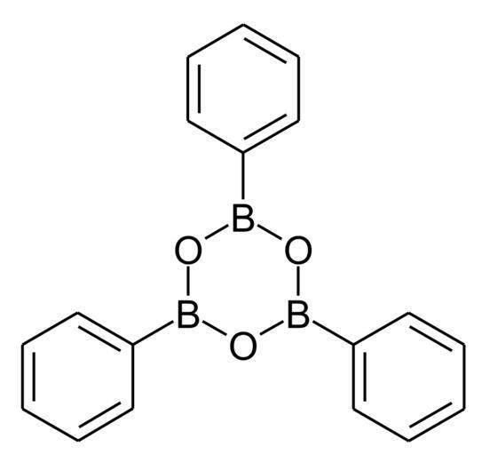 Keywords: Triphenyl boroxine structure.svg en Triphenyl boroxine de Triphenylboroxin own Steffen 962 2014-04-16 PD-chem Boroxins Cc-zero