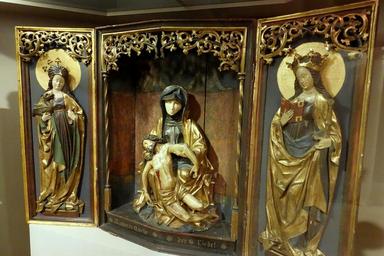 Keywords: Triptych altarpiece, Mutter Quelle der Liebe (Mother Source of Love), Germany, 16th century AD, wood, pigment, metal, plaster - Spurlock Museum, UIUC - DSC06132.jpg en Exhibit in the Spurlock Museum University of Illinois at Urbana-Champaign - Urbana-Champaign Illinois USA This work is old enough so that it is in the public domain 2015-06-14 16 51 28 own Daderot other versions cc-zero Art of Europe in the Spurlock Museum Altarpieces