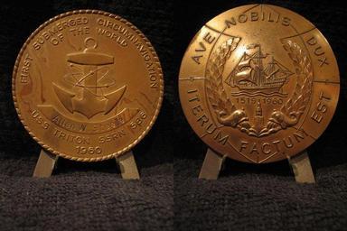Keywords: Triton Medal 01.jpg en Triton Medal This is a photograph of the Triton Medal presented to each member of the Circumnavigation Crew by Captain Edward L Beach who had the medals cast in Bremerhaven Germany when Triton visited that port in the fall of 1960 On the face of the medal is a clear anchor with three electron rings circling the shank The name of each recipient is engraved below the anchor crown Around the circumference of the medal's face is the inscription FIRST SUBMERGED CIRCUMNAVIGATION OF THE WORLD and USS TRITON SSRN 586 1960 The edge of the medal's face is encircled by rope On the reverse of the medal is a replica of The Triton Plaque Commander Allen W Steele USN ret http //garrygray tripod com/atws/atws_med htm Unofficial USS Triton web site U S Navy symbol 1960 Public Domain USS Triton SSRN-586 Operation Sandblast Medals of the United States PD-USGov-Military-Navy |