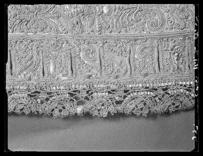 | Keywords: Tröja av guldlamé helt täckt av guldbroderi - Livrustkammaren - 19664.tif LSH artwork sv Förmodligen tillverkad i Frankrike Buren av Karl X Gustav 1622-1660 i samband med kröningen Dräkten beställdes 1654 från Frankrike genom Magnus Gabriel de la Gardie inför festligheterna vid Karl X Gustavs kröning och efterförljande bröllop Sex dräkter levererades och den här beskrivna var den högst värderade Ursprungligen var den försedd med 140 diamantknappar vilka änkedrottningen Hedvig Eleonora tog hand om efter kungens död Hon lät också sprätta bort merparten av guldspetsarna för att använda dem till utrustningen för kritzryttaren i makens sorgetåg Till dräktens kompletta utrustning hörde 1654 sko- och strumpeband av gllenduk högröda taftunderbyxor och silkesstrumpor ett guldbroderat gehäng hattband av guld handskar med gllenduksfodrade kragar en panasch med fjädrar i förgerna coleur de feu filemort och aurora samt ett par förgyllda sporrar och en värja med dito fäste I 1671 års inventarium står En Klädningh som är gjord till H K Maij tz Lÿcklige Cröningh och sägs omfatta följande plagg nämligen kappa tröja byxor knäband skorosor och handskar I 1654 års klädkammarräkning förtecknas dräkten under nr 3 på följande sätt 1 klädning och kappa av filemort gul oskuren sammet helt broderad med guld och med 140 diamantknappar till tröjan och byxorna 1 par strumpeband och skoband av rik guldbrokad helt broderade med guld 1 par underbyxor av incarnadie rosa taft och silkesstrumpor av samma färg 1 guldbroderat med guld och stofferade med guldbrokad 1 panasch plym av couleur de feu röda filemort och aurorafärgade fjädrar 1 par förgyllda sporrar och 1 värja med förgyllt fäste Nu finns endast tröjan och byxorna i behåll i sitt skick som dräkt medan den stora rundskurna kappan inte längre omtalas i inventarierna efter 1691 1704 års inv säger inget om kappan men den finns förvandlad till mässhake och altarbrun i Riddarsholmskyrkan Skänkta dit den 1 april 1705 av Riksänkedrottningen Hedvig Eleonora Mässhaken Gjord av tjock gul rips OBS Fel Enl Sveriges kyrkor skall vara sammet oskuren ett material som skiljer sig från såväl tröjans som byxornas Broderad med mönster i guld på samma sätt som på tröjan och byxorna Mönsterrapport 8 x 8 cm Såväl fram- som bakstycket består av 2 hopsydda våder av c a 40 cm bredd max längd ca 90 cm Drottningens namnchiffer HRS samt ANNO 1705 har broderats på respektive fram- och baksidorna Tröjan är sydd av vad man med ett modernt namn skulle beteckna som guldlamé som helt täckts med guldbroderi Den är av s k innocenttyp d v s ett relativt kort livplagg med planschetter inlagda som styvnad i framstyckenas snibbiga främre hörn försett med 10 små skört ståndkrage och relativt korta ärmar med öppna sömmar framtill På vänster framstycke har 17 st 2 cm knapphål sytts med jämna mellanrum ca 1 cm från kanten Vad man bör lägga märke till är att tröjan sytts av ett större antal stycken som skarvats samman Förmodligen har plagget antingen redan varit i tidigare bruk före kröningen 1654 och blivit något förtrångt eller också har man misslyckats med passformen vid tillfället i fråga och har varit tvungen att göra en del ändringar Möjligheten att tröjan kan ha förändrats vid något senare tillfälle kan man inte heller bortse ifrån Bottenmaterialet består nämligen av två skilda lamétyger ett något gulare i de smalare skarvarna och f ö ett något rödare det egentliga materialet Tröjan är huvudsakligen skuren i 2 framstycken 2 ryggstycken samt 2 ärmstycken till vardera ärmen 10 skört samt krage Man kan alltså visa att framstyckena måste skarvas med remsor av det gulare tyget utefter de raka framkanterna samt även i sidsömmen I halsringningen har en liten kil satts in mellan det vertikala skarvstycket fram och axelsömmen Bakstyckena ha fått var sin vertikala skarv knappt 4 cm bred mitt i ryggen på ömse sidor om mittsömmen Utefter ärmarnas öppna långsidor har vertikala stycken fogats till och nere vid ärmens avslutning har på undersidans stycken en smal horisontell remsa sytts På överärmstycket däremot har en horisontell skarv satts in överst uppe vid ärmringningen Kragen är också uppklippt baktill och försedd med 2 små skarvstycken Det 3 e skörtet på varje sida är eventuellt nysytt ty dess färg förefaller ljusare broderiet är klumpigare och kompositionen annorlunda mot alla de övriga 8 som exempelvis har den lilla blomman nedtill i mitten Mönstret har i någon mån missuppfattats i de senare sydda styckena så har man t ex lagt krepiner och trådar i båge i stället för att klippa av dem och börja med en ny tråd Ärmarnas nedersta parti mellan 3 5-7 cm är lämnat utan broderi beroende på att det ju skulle vikas till uppslag Ärmarna har inga knappar eller knapphål intill sprunden vid handlederna I midjan sitter på insidan under skörten 8 st små tampar med vardera 2 hål för byxornas hakar Guldlamén har en vådbredd av minst 31 cm utan stad 45x15 tr/cm2 Varje inslag består av gult silke med 2 och 2 smala trinda guldtenar på rätan Analysresultat Metalltråd tvinnad med textiltråd huvudbeståndsdelar Silver xxxGuld xKoppar xxxZink 0Det yttäckande läggsömsbroderiet består av kantiljer av trinda tenar och platta lan av olika bredd snodder med silkeskärna omtvinnade med guldlan strängar dragna av trinda tenar av guld eller silver som stansats ut i spiraler eller öglor och manglats platta på halva sidan här benämnda spiral- eller paljett strängar i brist på befintlig terminologi och 2 och 2 tätt liggande strängar med trinda smala guldtenar virade runt ett bredare guldanklätt snöre etc Broderiet är nersytt med gult silke Mönsterraporten är 6 5x6 5 cm Mönstret Ur 2 från varandra utåtböjda palmkvistar som strax nedanför mitten sammanhålles med en uppåtböjd båge växa omväxlande 5- oc